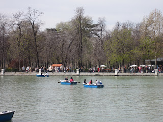 After redeeming our vouchers we continued our walk towards Parque Retiro. Along the way, we witnessed an older man peeing into a tree in a sidewalk. He didn't even have the care to turn his back to the busy street. The park had a lake in the middle that was filled with rowboats. There was a walkway all the way around the lake that was full of street entertainment. We glanced at some puppet shows, a dancer, and magician as we walked around. We went to the opposite side of the park to see the "crystal palace". Inside was some weird art exhibit and we didn't understand it. So we headed back to the busier area.